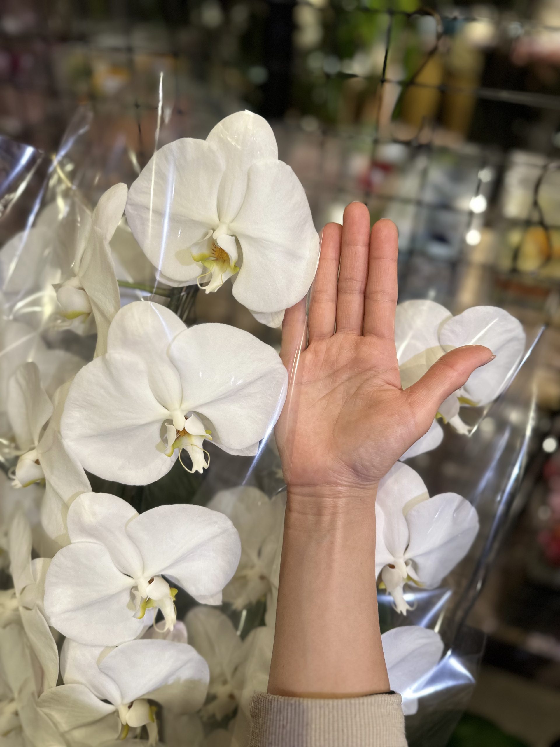 胡蝶蘭の花は、当店の女性スタッフの手のひらほどの大きさ😳