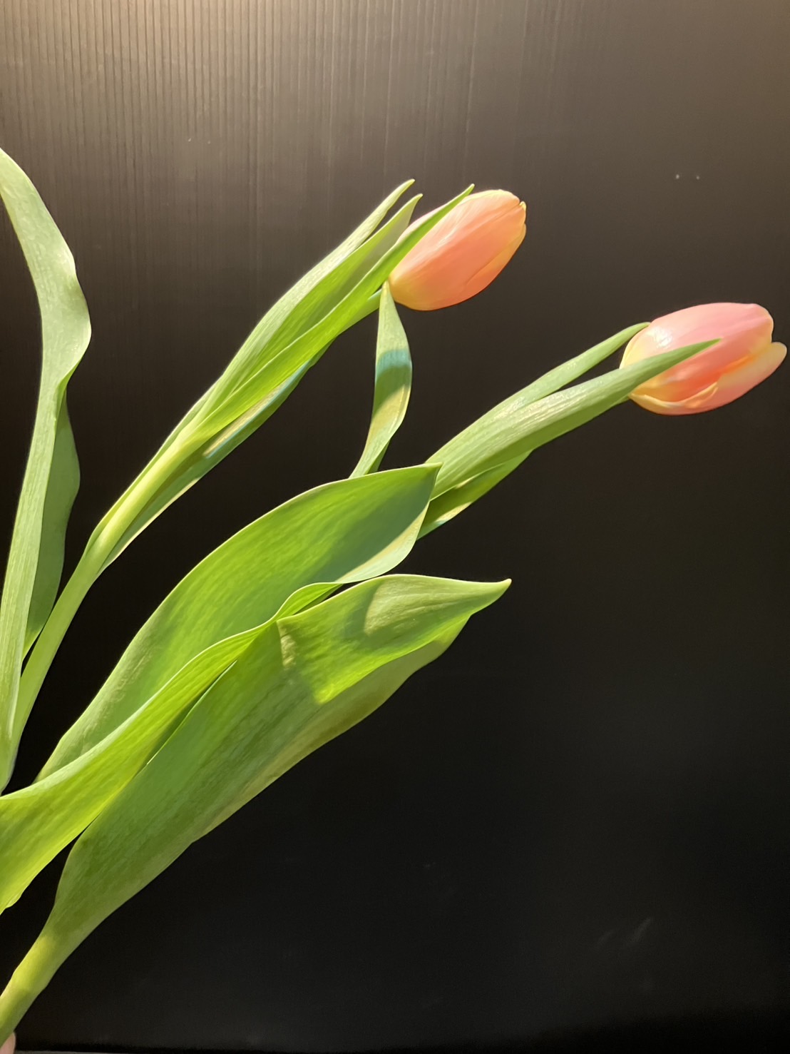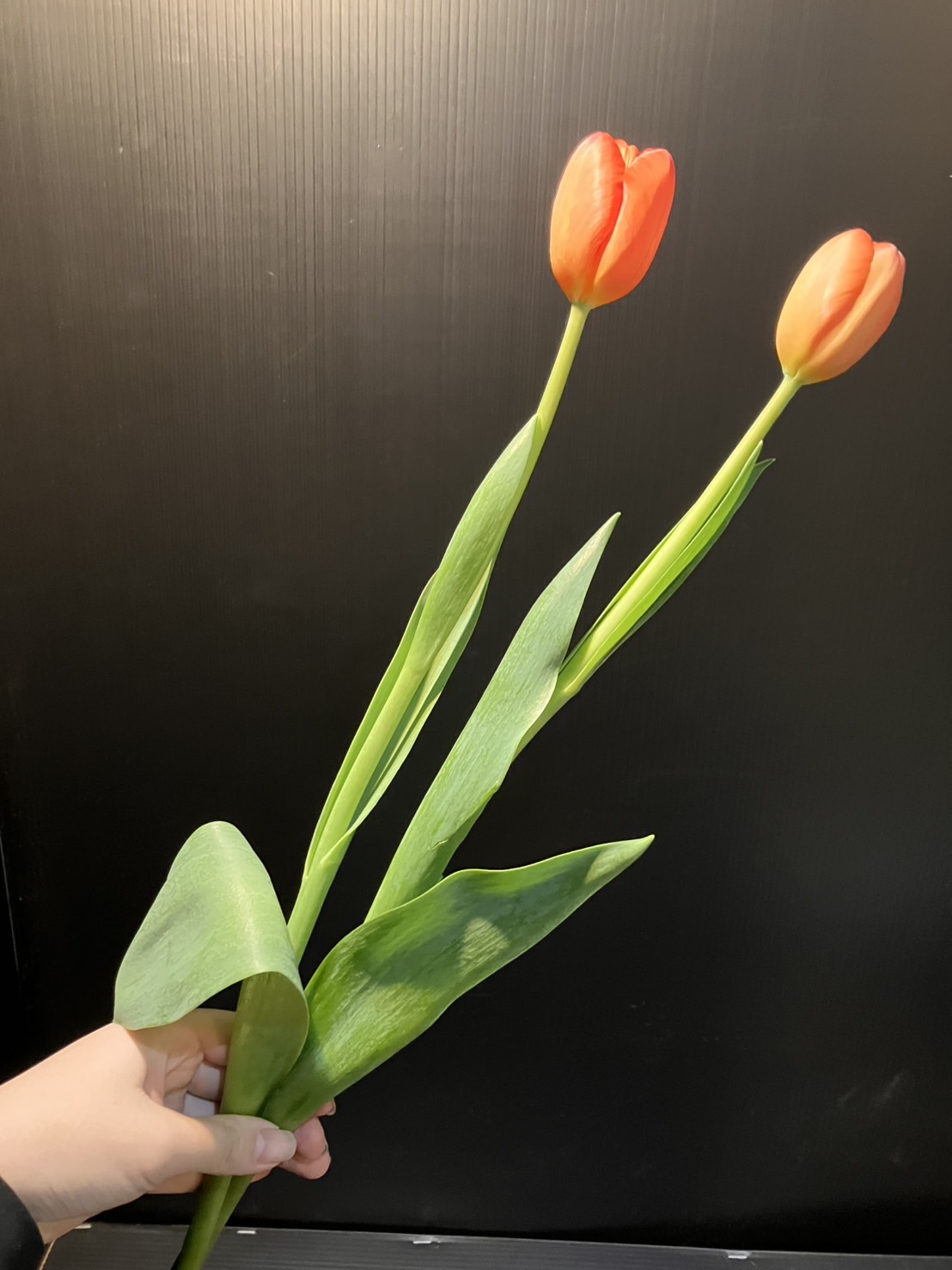 《デルタストーム》色と質感: オレンジ色からコーラル(珊瑚色)がかった色合いで、花びらにはサテンのような光沢があります。花びらの内側にはわずかにイエローオレンジの縁取りが見られることもあんですよ🧡