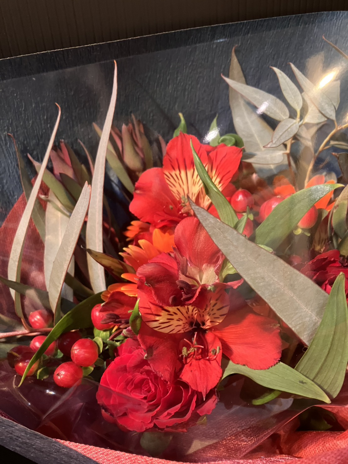 赤の花を使用し、ラッピングで落ち着いた雰囲をだした花束ですTEL•FAX 0263-26-0871