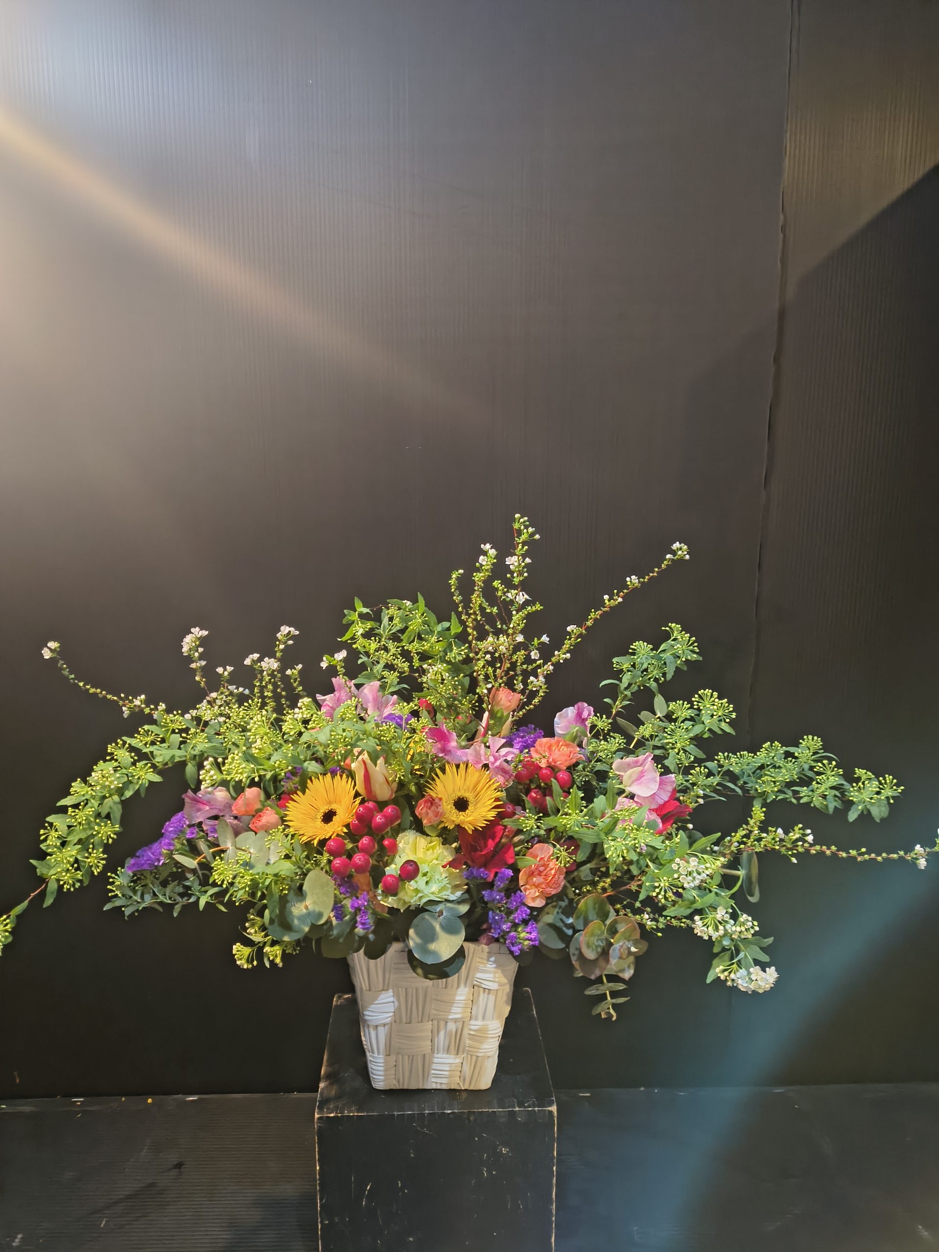 98歳の誕生日のお祝いにご用意させていただいたアレンジメントです。お客様より、長持ちするお花で色んなお花を入れて欲しいとのことで、スイートピーやチューリップ、コデマリなど代表的な春のお花を入れた合計11種の花材でお作りいたしました。