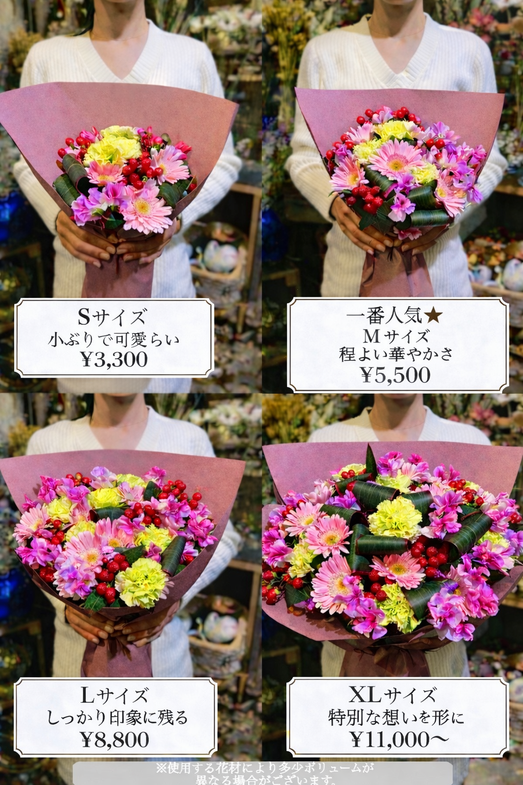 花束のサイズ(S・M・L・XL)をお写真とともにご紹介いたします。
