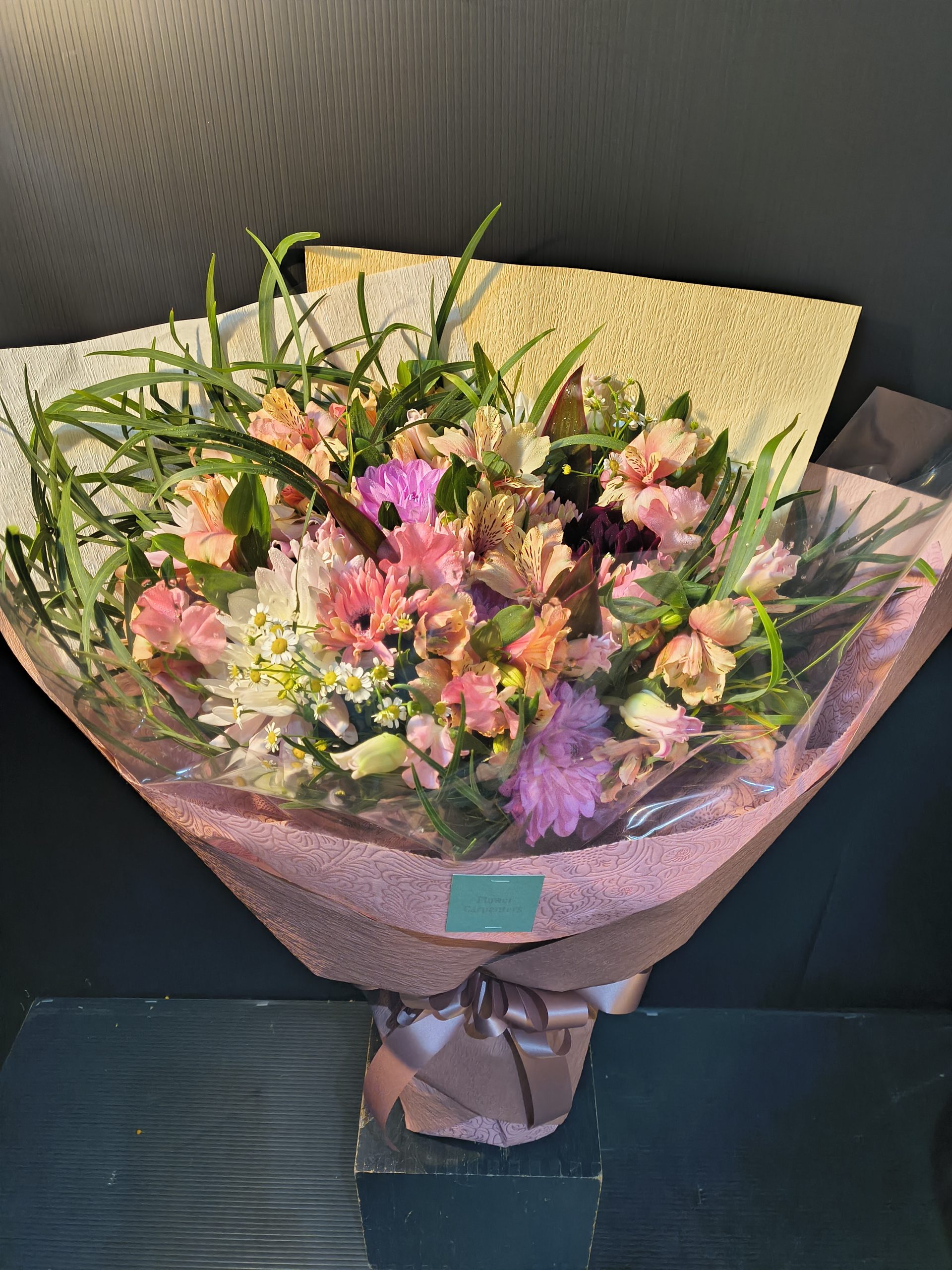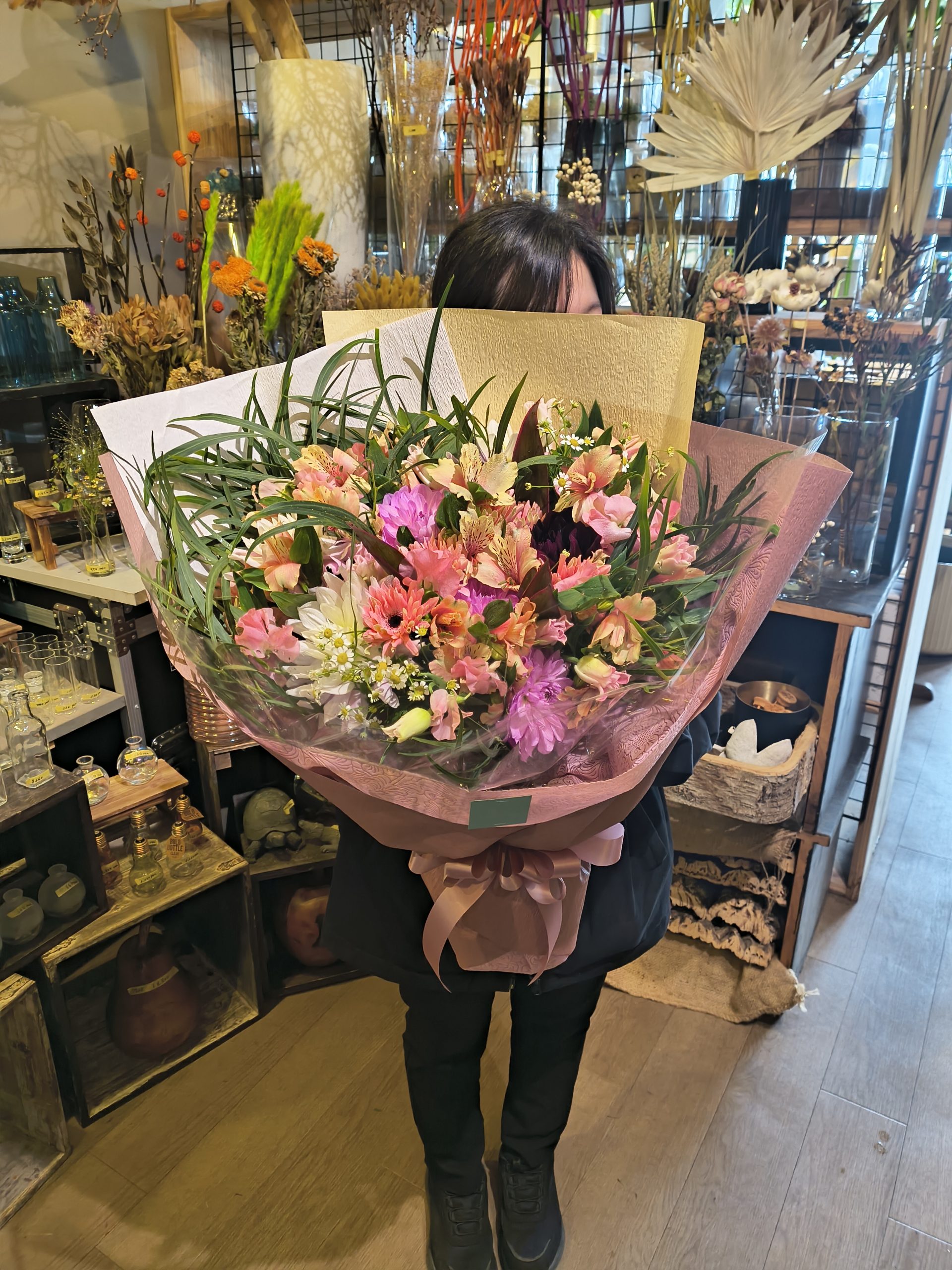 こちらはピンク色メインにお任せいただいた花束です。袴のお色味に濃い赤色という情報を伺っておりましたので、ワンポイントにダリアの黒蝶を使用させていただきました。